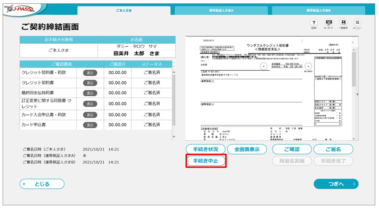 2.J-PASS〈ご契約締結確認〉画面で「手続き中止」ボタンを選択