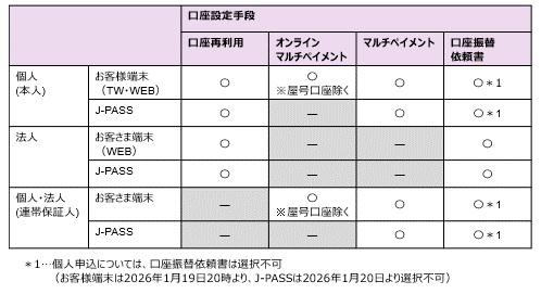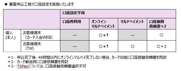 申込者・申込経路別の口座設定手段は以下の通りになります。■割賦・カード即時売上 カード即時発行(TOYOTA Walletアプリ申込) ※一部金融機関では屋号口座がマルチペイメントに対応していないケースがございます。マルチペイメントで口座設定できない場合は以下FAQをご確認ください。<FAQ>商用口座、身体的・環境的な理由、システム都合にてお客さまがデジタルで口座設定できない場合の対応方法を教えてください。※旧姓口座 or 本国名・通称名の口座の場合、審査申込時に口座名義を入力して承認取得し、契約締結時も同じ名義であればオンラインマルチペイメント対応可能です。詳細は、以下のリンクをご確認ください。<FAQ>お客さまの氏名と口座名義が異なる場合の入力方法を教えてください。(屋号口座/旧姓口座/外国人申込)