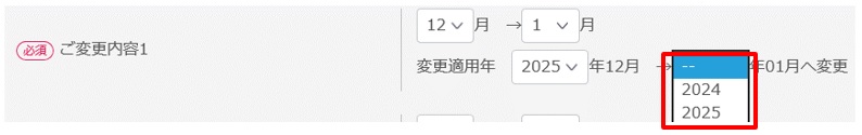 「変更適用年」は翌年までしか選択ができないため、年が明けてから申請をお願いいたします。(例)2024年時点で、2025年12月のボーナス支払いを2026年1月に変更したい場合 ⇒2025年1月に入ってから申請をお願いいたします。